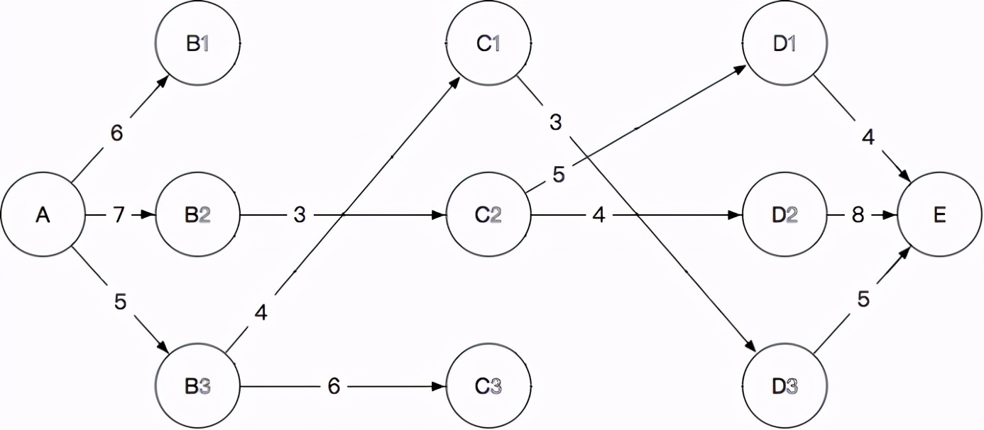 (S到E点的最短距离就是S到第t=n列各结点o(tn,1)、o(tn,2)、o(tn,3)最短距离的最小值)
